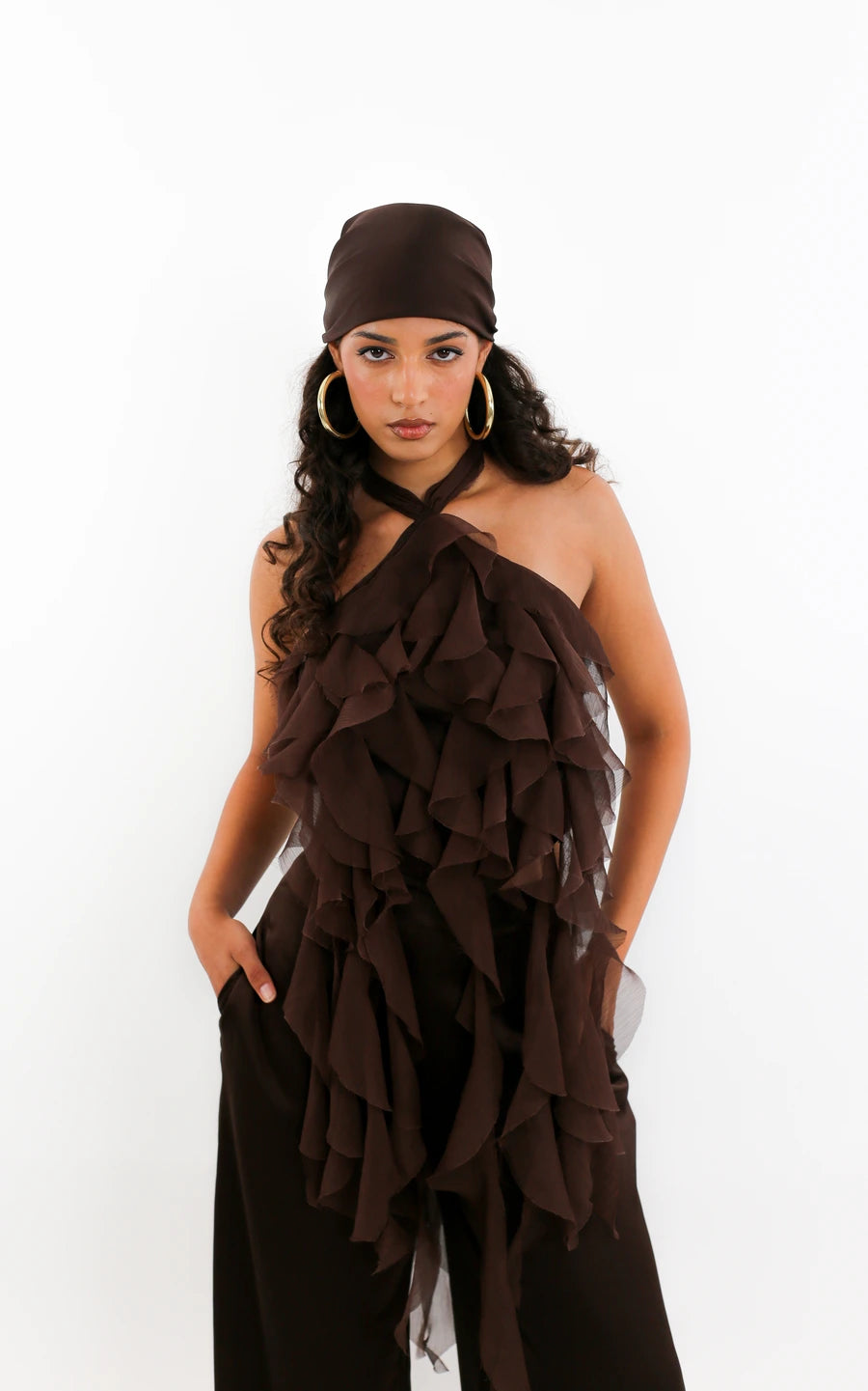 Satin diamond-cut top, adorned with long chiffon ruffles, featuring chiffon ties at the neck and back, with an elegant open back.